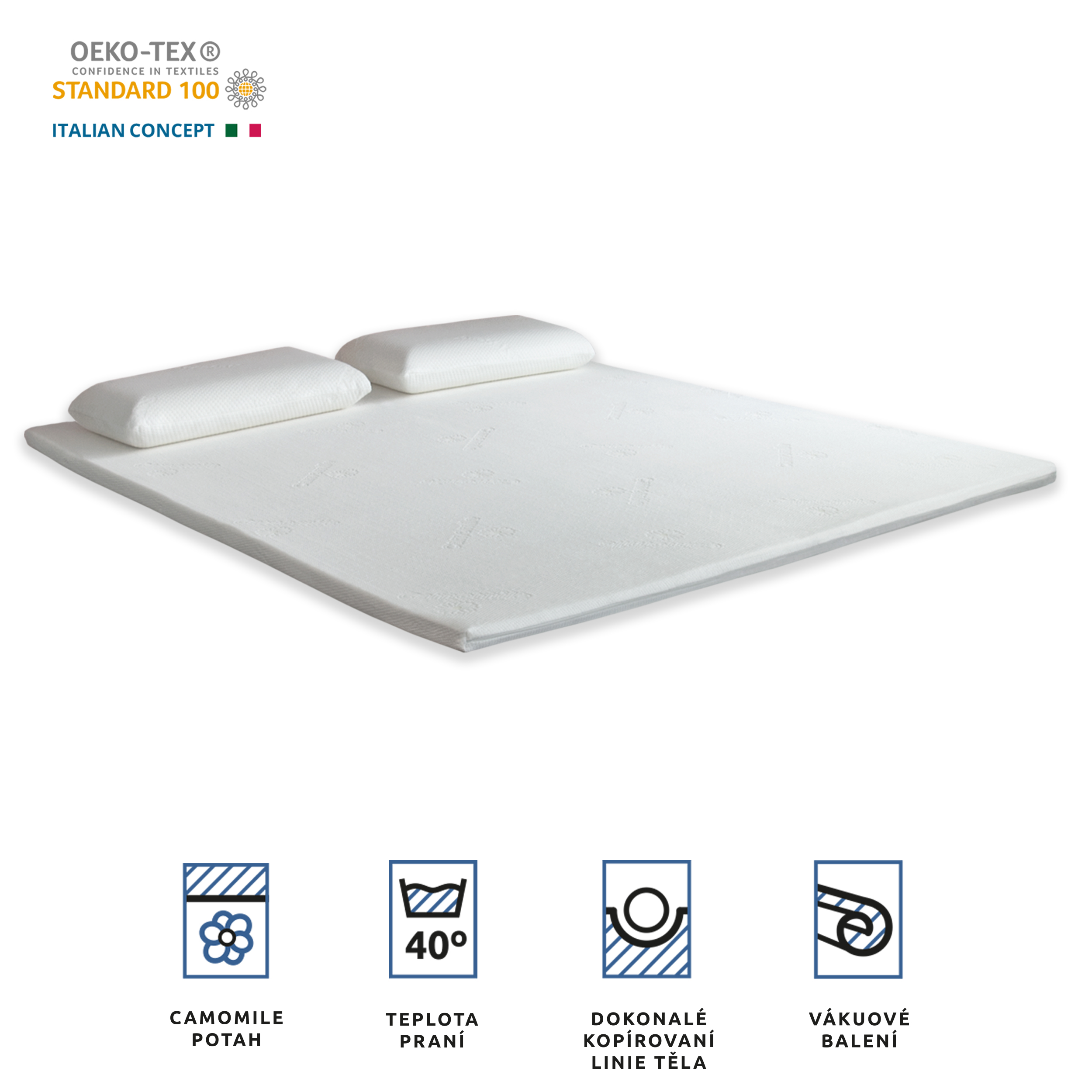 Potah protkávaný kamilkami má antibakteriální a zklidňující účinky, zaručuje pohodlný a relaxační spánek. Je odnímatelný, lze ho prát na 40 °C.