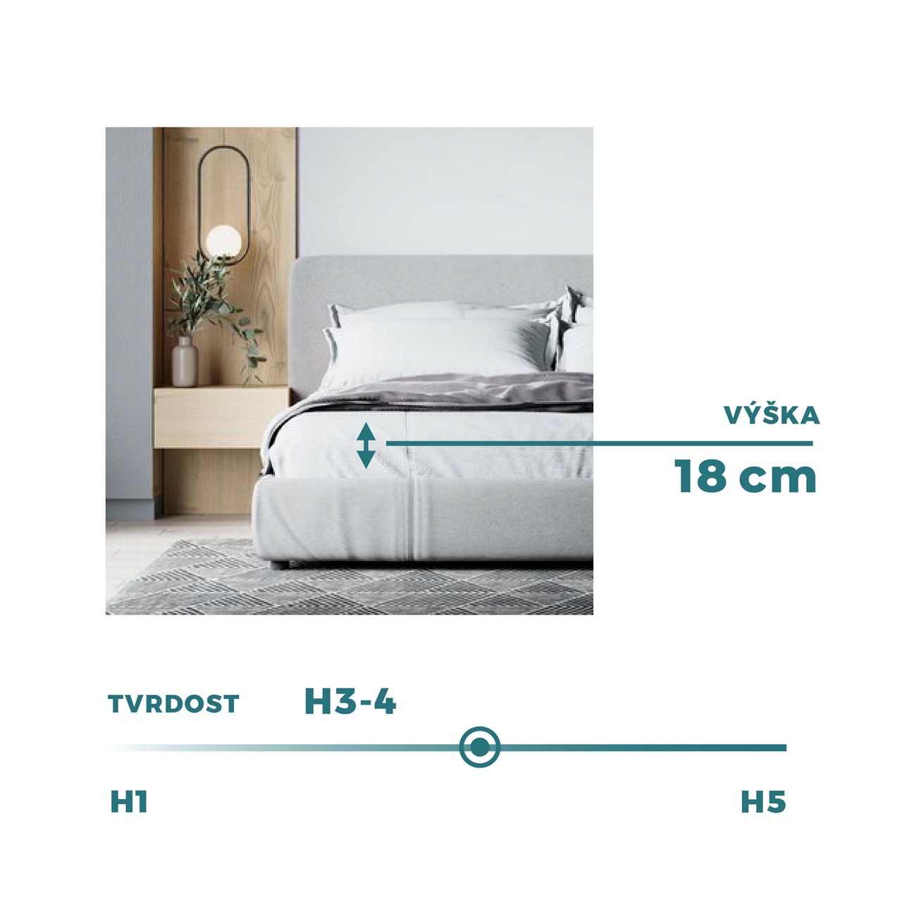 - 12 cm ortopedická polyuretanová pěna (hustota 30 kg/m3, tlak 3,8 kPa).